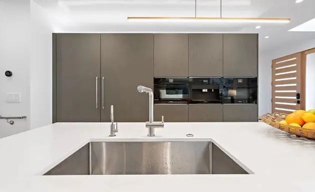 Matte lacquer handleless design and concrete cabinetry